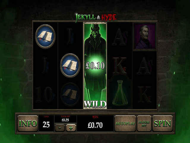 Symbolerna är en blandning av karaktärer ur berättelsen (inklusive Jekyll och Hyde), drycker och gifter, böcker samt standardbokstäver som du hittar på de flesta enarmade banditer. Drycken är scatter-symbolen som aktiverar läget med gratis spins. Mer om det om ett ögonblick ... Vinster betalas ut från vänster till höger precis som vanligt och det finns en maximalinsats på 250 mynt. Avkastningen ligger på drygt 95% och det finns en funktion som ökar dina chanser att vinna ännu mer. Om du kombinerar detta med bonusläget finns det en säker vinstpotential.